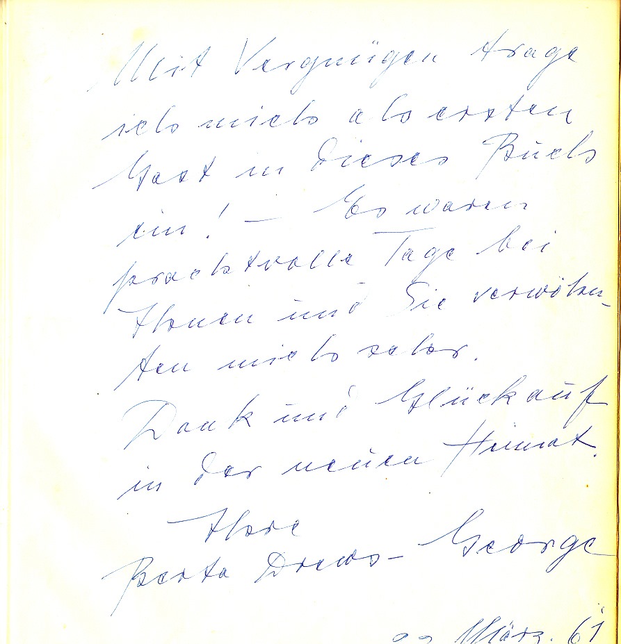 Hier seht ihr den ersten Eintrag von Berta Drews George im Gästebuch des Restaurants Indonesia Bar. Einen Eintrag ihres später berühmten Sohnes Götz haben hüten wir wie einen Schatz in unserem Archiv.